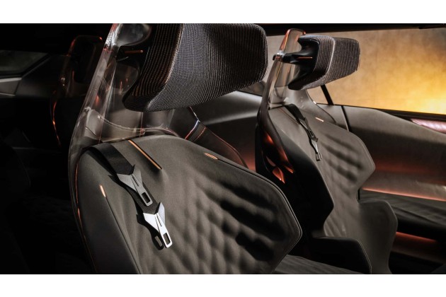 Unterhalb, anstelle eines klassischen Kühlers, sitzt ein Display mit eindrucksvoll fluoreszierenden Bildern. Sicher Teil der Studie, aber wohl eher als Designidee zu verstehen. Die Seitenansicht wirkt athletisch und muskulös, mit starkem Spiel von Licht, Materialien und Details. So bestehen die hinteren Kotflügel nicht etwa aus Carbon, wie man vermuten könnte, sondern aus Bicomp - einem Verbundstoff mit Leinenfasern. Das Ergebnis wirkt dennoch äußerst hochwertig.