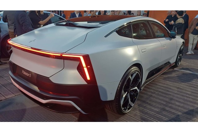Am Heck gibt es eine durchgehende Lichtleiste, die an den äußeren Enden fast rechtwinklig nach unten abkippt, sowie einen Heckdiffusor. Der cW-Wert des Basismodells wird mit 0,24 angegeben. Die Türgriffe sind versenkt, die Fenster rahmenlos. Der Polestar 5 ist in sechs Lackierungen erhältlich, aber nicht in bunt: Es gibt ausschließlich Weiß-, Silber, Grau- und Schwarztöne. Darunter sind jedoch auch zwei matte Lackierungen in Silber bzw. Grau.
