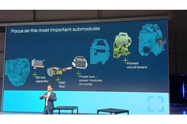 Weitere Besonderheit: Der Inverter arbeitet mit Siliciumcarbid-Halbleitern (SiC) und ist damit besonders effizient. Unseres Wissens ist das der erste Inverter mit dieser teuren Technik im Kleinwagensegment. VW hat vier Schlüsselelemente des Inverters selbst entwickelt. Die SiC-Chips stecken in den Power-Modulen; sie tun die eigentliche Arbeit des Umrichtens. Dazu kommt noch ein Kondensator ("DC link capacitor") und ein Filter, die zusammen für "sauberen" Wechselstrom sorgen, sowie eine gedruckte Leiterplatte ("circuit board").