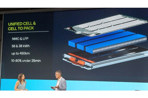 In der Electric Urban Car Family werden wie erwähnt eine NMC-Batterie mit 56 kWh und ein LFP-Akku mit 38 kWh eingesetzt. Die größere soll bis zu 450 km Reichweite ergeben, die kleinere dann wohl rund 300 km. Wenn wir rechts verstanden haben, sollen sich beide in weniger als 25 Minuten von 10 auf 80 Prozent bringen lassen. Wenn die angegebenen Zahlen Nettowerte sind, errechnen sich daraus Ladegeschwindigkeiten von 56 kWh*0,7/25 min = 1,6 kWh/min bzw. 1,1 kWh/min.