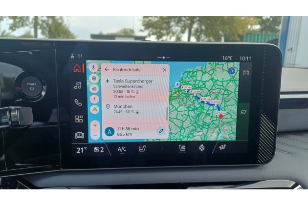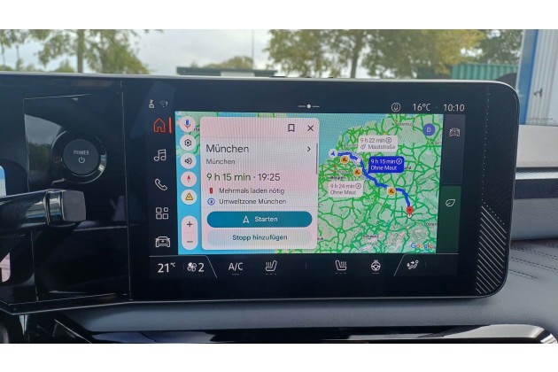 Der Touchscreen misst stets 10,1 Zoll. Er wirkt etwas klein, zum Beispiel wenn man sich einen Überblick auf der Karte verschaffen will oder bei der Routenplanung die Liste der Ladestopps durchgehen will. Apropos Ladeplanung: Die übernimmt Google Maps. Das funktioniert einfach und schnell - vor allem, wenn man die Sprachbedienung Google Assistant dafür verwendet. Ich sagte einfach "Navigiere nach München", und binnen Sekunden wurde eine etwa 850 km lange Route angezeigt. Im nächsten Schritt können die Ladestopps eingeplant werden. Zu jedem Ladestopp wird angegeben, bei welchem Ladestand man ankommt und wie lange man laden soll.