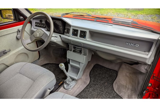 Bereits die ADAC-Tester lästerten damals mit Blick auf den größeren Yugo Florida, die Verarbeitung sei "weit unter dem Klassenstandard", der Kunststoff wirke billig. Wohl wahr. Rund 35 Jahre später schlägt mir der scharfe Geruch mit entfleuchenden Lösungsmitteln in die Nase, das übersichtliche Cockpit hat Playmobil-Niveau. Vom Lenkrad ganz zu schweigen, es hat die Haptik einer Lakritzschnecke.
