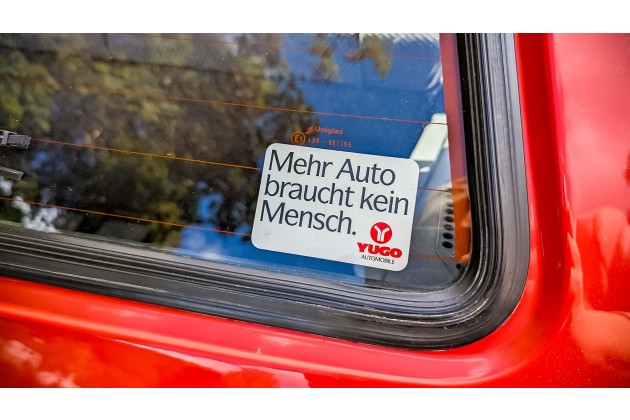 Mit dieser Vorgeschichte besteige ich den Yugo beim CDE Classic Event 2025. Es muss sich um ein Fahrzeug handeln, welches ab 1990 offiziell nach Deutschland importiert wurde. Darauf weist der Aufkleber "Yugo - Mehr Auto braucht kein Mensch" in der Heckscheibe hin. Und darunter steht "45A", also 45 PS, 903 Kubik, Weber-Einfachvergaser. Neupreis damals: 9.980 Mark. Ein VW Polo war gut 6.000 Mark teurer. Für 18.960 Mark gab es übrigens das schicke Cabrio.