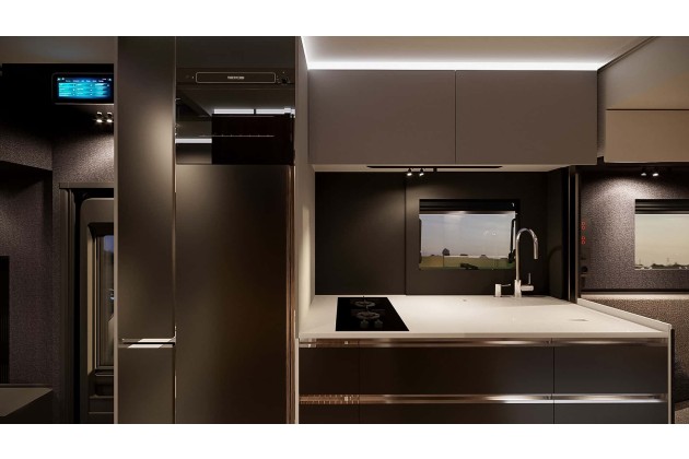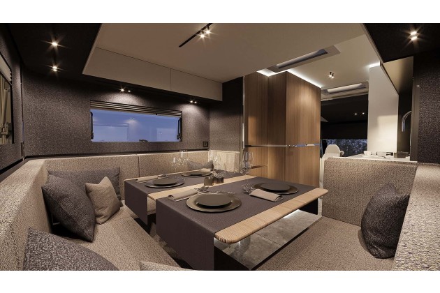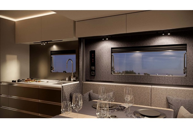 Für Komfort sorgt die Truma 6E-Heizung, optional in Diesel-Ausführung. Eine 12-Volt-Klimaanlage mit 8.000 BTU ist ebenfalls zu haben und sitzt unsichtbar im Doppelboden. Dank 30 Millimeter starker Isolierung, GRP-Aufbau und beheiztem Boden bleibt der Camper winterfest.