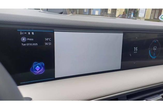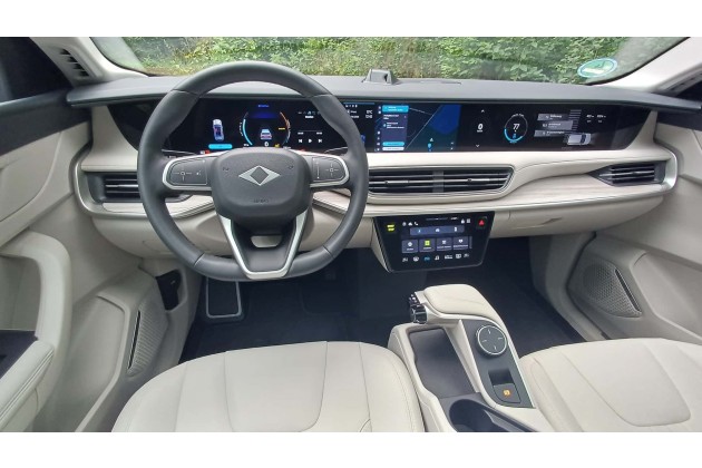 Innen empfängt mich ein Cockpit mit den aufpreispflichtigen cremefarbenen Sitzen aus veganem Leder. Die Materialien sind auf Premium-Niveau; die schicken Holzleisten erinnerten mich an Volvo. Dazu kommt ein wahrhaft gigantisches Display, das sich von ganz links bis ganz rechts spannt. Funktionell besteht es aus einem 12,3 Zoll großen Instrumentendisplay sowie 29 Zoll für drei weitere Touchscreens.
