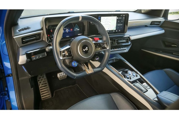 Im Fall unserer GT-Premium-Ausstattung sind 19-Zöller mit blauen Bremssätteln serienmäßig, ebenso eine blaue Zierleiste entlang der Seitenfenster. Die französische Flagge an der C-Säule kostet 50 Euro Aufpreis. 100 Euro werden für die blaue Lenkradnabe fällig, 900 Euro für das "Alpine Vision Blau".