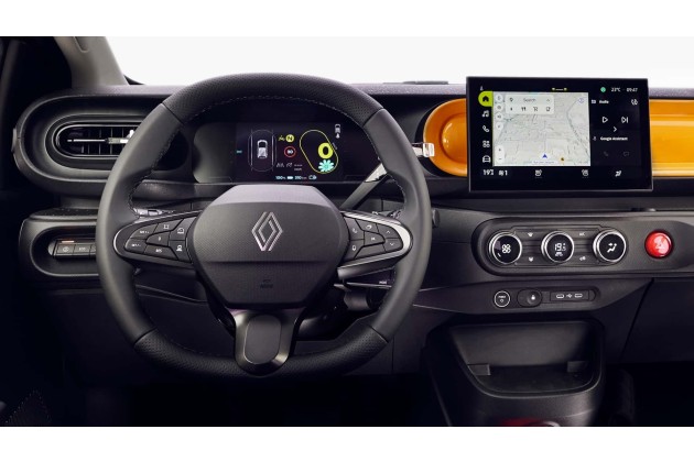 Das Innendesign ist einfach, aber gepflegt: Wiederholte kreisförmige Elemente, Materialien in Wagenfarbe, ein roter Notknopf in der Mitte des Armaturenbretts als direkte Hommage an den Twingo I. Es ist eine Kombination aus Erinnerung und Funktionalität, ergänzt durch zeitgenössische Technologien: Digitale Instrumente (die es auch schon 1992 gab), OpenR und integrierte Google-Schnittstelle.