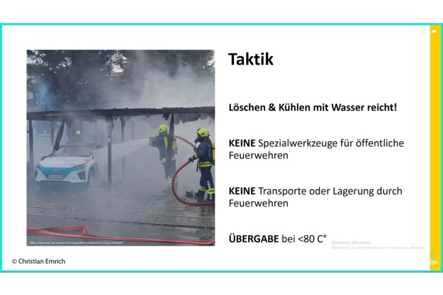Dritte Überraschung: Gekühlt wird mit normalen Feuerwehrschläuchen. Man spritzt also Wasser von unten an den Akku. Sobald die Temperatur der Batterie stabil unter 80 Grad Celsius liegt, wird das Fahrzeug dann an ein Abschleppunternehmen übergeben. Die Firmen übernehmen Elektroautos in der Mehrheit inzwischen ohne Probleme, so Emrich.