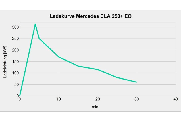 Auto-Bild schreibt, dass man beim CLA nur dann über 300 kW Ladeleistung kommt, wenn man bei 10 % Ladestand (SoC) oder darunter mit dem Laden beginnt. So einfach ist es nicht, wie der Ladetest von MeinandersTV zeigt. Hier wurde schon bei einem Akkustand von 19 Prozent eine maximale Ladeleistung von 313 kW erreicht. Auch hier fiel die Ladeleistung ziemlich schnell ab. Der Kollege lud den Akku von 19 bis 77 %; die durchschnittliche Ladeleistung lag bei sehr guten 187 kW.