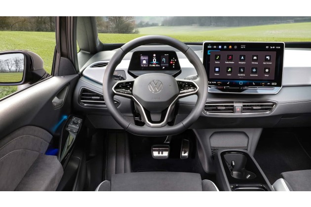 An den Türinnenseiten sind die silbrigen Türöffner aus dem neuen T-Roc zu erkennen. Statt mit drei Knöpfen wie beim ID.3 werden die elektrischen Fensterheber wieder mit vier Tasten gesteuert. Die Armaturentafel ist mit hellgrauem Stoff bespannt, der vage an den Wollstoff im Volvo EX30 erinnert. Ebenfalls neu ist die weiße Ziernaht an den Tür-Innenseiten, die am vorderen Ende in eine kleine "Volkswagen"-Plakette ausläuft.