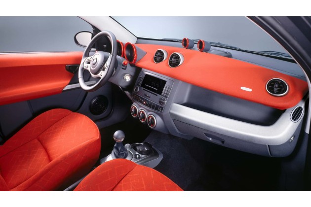 Schon aus größerer Entfernung sind die typischen Markenelemente erkennbar, darunter die markante Türkontur und die charakteristische Tridion-Zelle. Eine prägnante Sicke auf Höhe der Türmitte ergänzt den Auftritt. Auch innen zitiert der Forfour typische Smart-Elemente jener Zeit, bei Bedarf ist das Cockpit sehr farbenfroh.