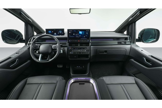 Wie erwähnt, wird der Staria stets von einem 160-kW-Frontmotor bewegt. Mit dem 84-kWh-Akku sind etwa 400 km nach WLTP möglich. An der Wallbox wird serienmäßig mit 11 kW Wechselstrom geladen, zur maximalen DC-Ladeleistung gibt es noch keine Angaben. Dank 800-Volt-Architektur dauert der Ladehub von 10 auf 80 % aber nur etwa 20 Minuten. Das Auto unterstützt das bidirektionale Laden (Vehicle-to-Load, V2L), und zwar mit Anschlüssen außen wie innen.