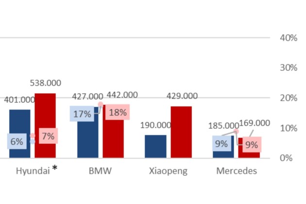 Der VW-Konzern steigerte seine Elektroauto-Verkäufe um 32 Prozent auf 983.000 Stück. Die VW Group lieferte sich ein Kopf-an-Kopf-Rennen mit der SAIC Group, die nach CAM-Schätzungen auf ähnliche BEV-Absätze kommt. Bei Volkswagen stieg der Anteil der BEVs an den Gesamtverkäufen von 9 auf 11 Prozent.