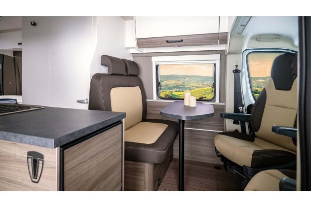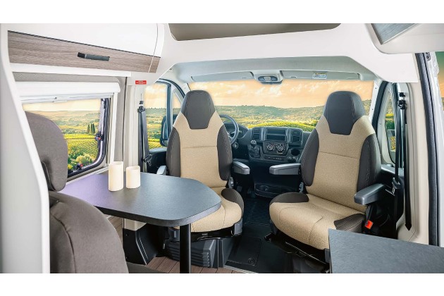 Gegenüber liegt die Sitzgruppe, die bewusst auf überdimensionierte Polster oder komplexe Umbauten verzichtet. Ein kompakter Tisch, zwei vollwertige Sitzplätze und eine klare Anordnung machen den Bereich alltagstauglich. Ob Frühstück, Laptop oder Regentag - der Wohnraum erfüllt seine Aufgabe, ohne sich in den Vordergrund zu spielen.