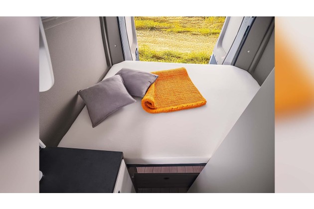 Im Heck wartet das bekannte Loungebett, das mehr kann als nur Schlafplatz sein. Es lässt sich hochklappen, verschieben oder bei Bedarf komplett entfernen. Je nach Reiseprofil entsteht so mehr Stauraum, mehr Bewegungsfreiheit oder einfach ein luftigeres Raumgefühl. Der Umbau gelingt ohne große Verrenkungen und unterstreicht den funktionalen Anspruch des Fahrzeugs.