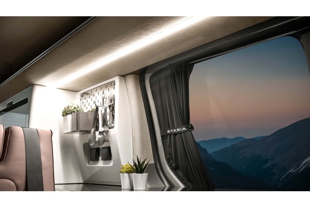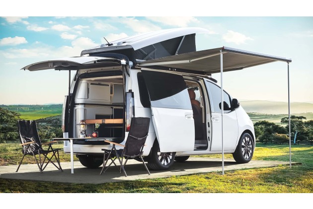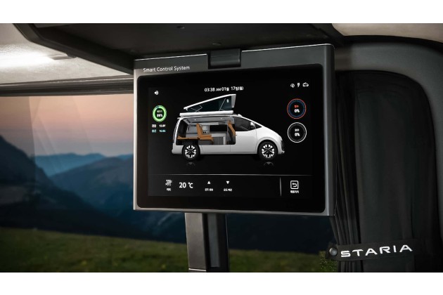 Im Dach steckt auch die eigentliche Ansage des Konzepts: ein 520-Watt-Solarmodul, das unter Idealbedingungen bis zu 2,6 kWh pro Tag liefern soll. Das ist keine Spielerei für LED-Streifen, sondern ausreichend für Kühlbox, Licht, Lüftung und kleinere Verbraucher - auch mehrere Tage ohne externe Stromquelle. Hyundai positioniert den Staria damit nicht nur als Campingplatz-Begleiter, sondern als Fahrzeug fürs Freistehen und längere Auszeiten jenseits der Steckdose.