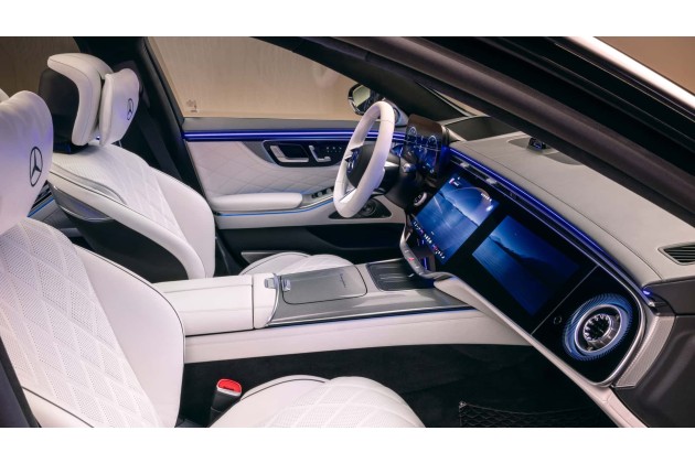 Neu im Fond sind zwei abnehmbare MBUX-Fernbedienungen mit denen man Fahrzeugfunktionen wie Klimatisierung und Sonnenschutzrollos sowie die nun größeren 33,3-Zentimeter-Displays hinter den Vordersitzen bedienen kann. Die Bildschirme verfügen zudem über integrierte HD-Kameras und eignen sich damit für geschäftliche Videokonferenzen mit Microsoft Teams, Zoom oder Webex.