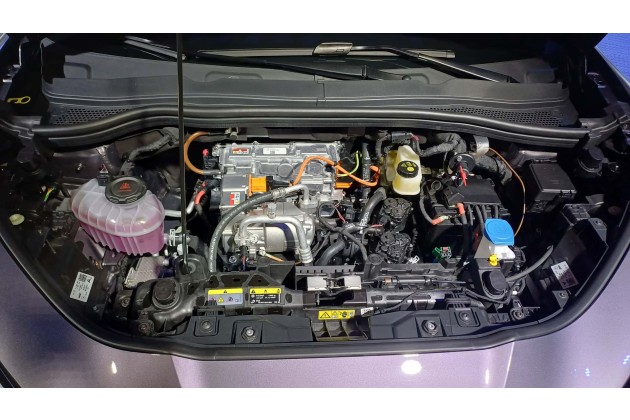 Wir sahen unter die Fronthaube und stellten fest, dass der Inverter senkrecht steht. Den Grund für diese ungewöhnliche Lösung kennen wir bisher nicht. In der Mitte des Motorraums ist der Klimakompressor auf einem Gummilager positioniert, wodurch verhindert wird, dass sich seine Vibrationen auf das Auto übertragen.