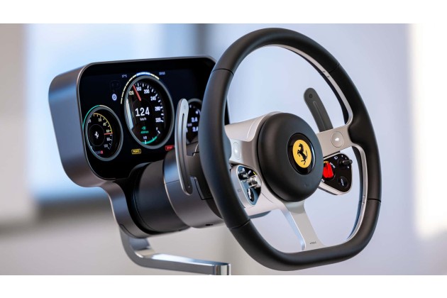Für das Lenkrad wählte man eine Dreispeichenform, die zur Ferrari-Tradition passt. Dabei bestehen die Speichen aus unverkleidetem Aluminium. Hinter dem Lenkrad gibt es zwei große Paddles, während auf den waagerechten Speichen Pfeiltasten zu sehen sind. Darunter gibt es jeweils ein dreieckiges Bedienfeld. Rechts lässt sich das Auto auf verschiedene Fahrbahneigenschaften wie Ice, Wet oder Dry einstellen, außerdem das Fahrwerk und die Scheibenwischer, links werden der Abstandstempomat und diverse Fahrmodi (Range/Tour/Perfo) aktiviert.