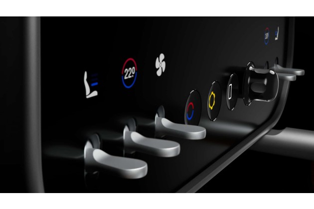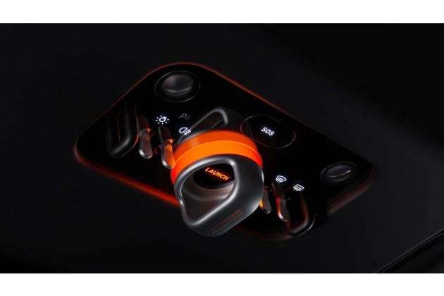 Das mittig integrierte "Bedienfeld" ist kugelgelagert, sodass es wahlweise zum Fahrer- oder Beifahrersitz ausgerichtet werden kann. Eine Handballenauflage darunter erleichtert die Bedienung. Rechts oben ist der "Multigraph" integriert, eine Analoguhr, die tatsächlich noch ein Uhrwerk besitzt - mit drei unabhängigen Motoren, welche die Zeiger bewegen. Ansonsten wird die Fläche für ein Display mit vier Modi genutzt: Uhr, Chronograph, Kompass und Launch Control. Darunter gibt es wieder physische Bedienelemente für Sitzheizung und -belüftung sowie die Klimasteuerung.