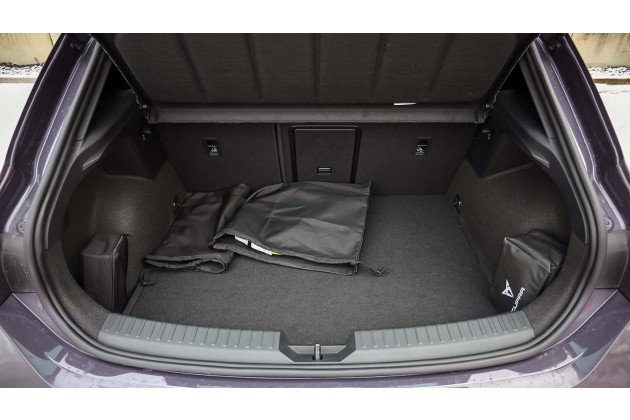 Die Platzverhältnisse fallen kompakttypisch aus. Vorne sitzt man gut und auch hinten hat man für ein Kompaktmodell erstaunlich viel Platz, starrt aber auf die voluminösen Rückenlehnen der Sportsitze.. Der Kofferraum fasst wegen der 19,7-kWh-Batterie nur 270 Liter, deutlich weniger als im konventionellen Leon. Für den Wocheneinkauf reicht es, Urlaubsgepäck für vier Personen wird zur Tetris-Aufgabe. Viel ärgerlicher ist allerdings das dadurch fehlende Unterflurfach, wodurch die Kabeltaschen im Kofferraum reisen müssen und viel vom ohnehin knappen Platz rauben.