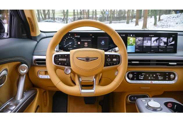 Im Innenraum werden die ursprünglich zwei Displays jetzt nicht mehr durch eine Blende getrennt. Das 27-Zoll große Doppeldisplay kann für ausgewählte Anzeigeoptionen auch durchgängig Grafiken zeigen und nutzt den gewonnenen Raum besser aus als sein Vorgänger. Insgesamt läuft das System Hyundai-Motor-Group-typisch flüssig und übersichtlich. Zudem kommt jetzt ein Drei-Speichen-Lenkrad statt eines mit zwei Speichen zum Einsatz.