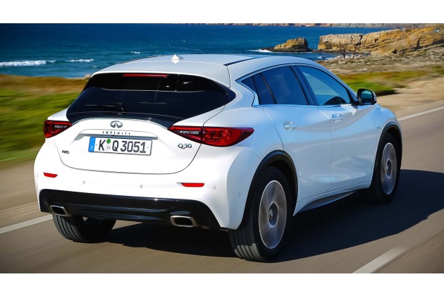 Obwohl die technische Basis stark an Mercedes angelehnt war, entwickelte Infiniti ein eigenständiges Design. Charakteristisch sind geschwungene Linienführungen und stark modellierte Seitenflächen. Abmessungen und Radstand entsprechen weitgehend den Plattformspendern; mit 2,70 Metern Radstand bewegt sich der Q30 auf dem Niveau der A-Klasse und ihres SUV-Ablegers.