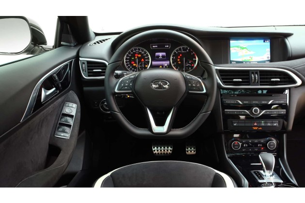 Der Innenraum zeigt deutliche Anleihen bei Mercedes. Lenkrad, Klimabedienung, Sitzverstellung und einzelne Schalter wurden übernommen. Gleichzeitig integrierte Infiniti das Infotainmentsystem optisch stärker in das Armaturenbrett. Die Bedienbarkeit gilt als intuitiv, die Ablesbarkeit der Instrumente als gelungen.