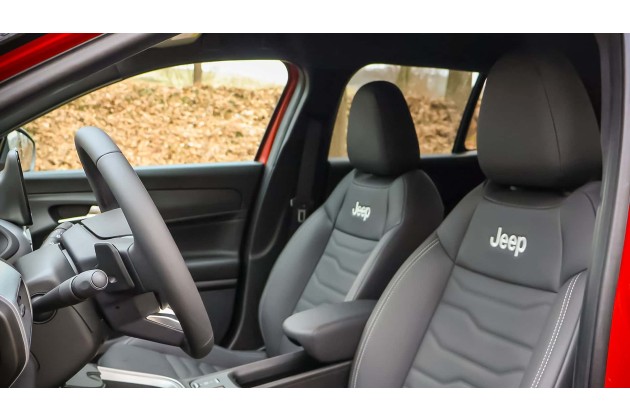 Im Innenraum setzt der Jeep Avenger 4xe eher auf Understatement. Nur ein Schriftzug auf der rechten Seite des Armaturenbretts weist auf seine gewachsene Geländegängigkeit hin. Strapazierfähige, wasserdichte Polsterbezüge sollen für leichte Reinigung sorgen. Ein nettes Detail, doch mehr Konsequenz wäre gut gewesen. Denn Reste von den gegebenenfalls schlammigen Schuhen müssen noch immer aus Teppich und Veloursfußmatten geschrubbt werden.