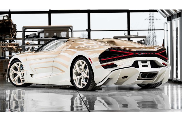 Auch die Räder greifen das Farbkonzept auf. Diamantgeschliffene Felgen erhielten eine speziell entwickelte Lackmischung, die das Zusammenspiel von Gold- und Weißtönen fortsetzt und die Lichtwirkung der Karosserie unterstützt. Im Innenraum setzt sich dieses Gestaltungsthema konsequent fort. Sämtliche Carbonflächen wurden weiß lackiert, wodurch ein kompakt wirkendes Cockpit mit starkem Fokus auf Materialwirkung entsteht. Türverkleidungen mit Linien in Weiß und warmem Gold folgen den konkav modellierten Flächen und betonen deren Geometrie.
