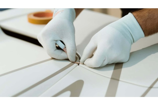 Die charakteristischen Trennlinien in Weiß und Gold wurden in einem aufwendigen manuellen Verfahren realisiert, das präzises Abkleben, mehrschichtige Lackierung und zahlreiche Arbeitsstunden erforderte. Oder um es volkstümlicher zu formulieren: eine Schweinearbeit ...
