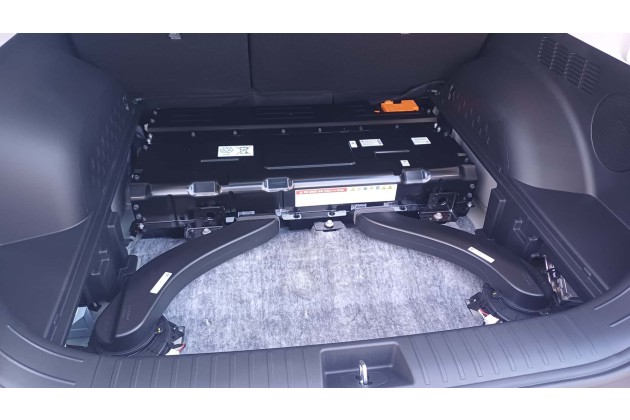 Da der Stack maximal 110 kW liefert, wird noch eine knapp 3 kWh große Pufferbatterie im Kofferraumboden eingebaut, die bis zu 80 kW zusteuern kann. Obwohl die Summe der Ausgangsleistungen von Stack und Batterie 190 kW ergibt, kann der Motor nicht mehr als 150 kW davon nutzen.