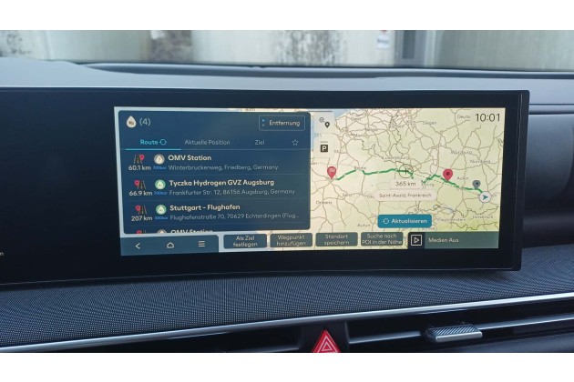 Zum Auffinden der Tankstellen kann man die App von H2Live verwenden oder man nutzt das eingebaute Navi. Letzteres habe ich ausprobiert. Ich gab als Ziel das 830 km entfernte Paris ein und das System empfahl mir eine Tankstelle am Stuttgarter Flughafen, die allerdings nur 350 bar liefert. Wenn ich das System richtig verstanden habe, sollte dieser Stopp ausreichen. Die 620 km von Stuttgart nach Paris sind beim Nexo tatsächlich mit einer Tankfüllung möglich, aber nicht mit 350 bar. Offenbar hat das System das nicht einberechnet.