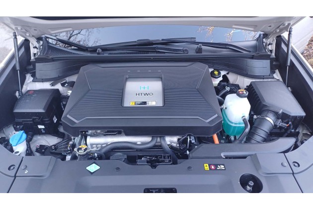 Als Brennstoffzellenauto nutzt der Nexo Wasserstoff als Energieträger. Knapp 6,7 Kilo davon sind in drei Gasbehältern enthalten, die quer vor der Hinterachse liegen. Das bei 700 bar gespeicherte Gas wird nach vorne zum Brennstoffzellen-Stack geleitet, wo es auf elektrochemischem Wege mit Luftsauerstoff zu Wasser reagiert. Dabei entsteht elektrische Energie, die zum Betrieb des 150 kW starken Permanentmagnet-Synchronmotors (PSM) an der Vorderachse genutzt wird.