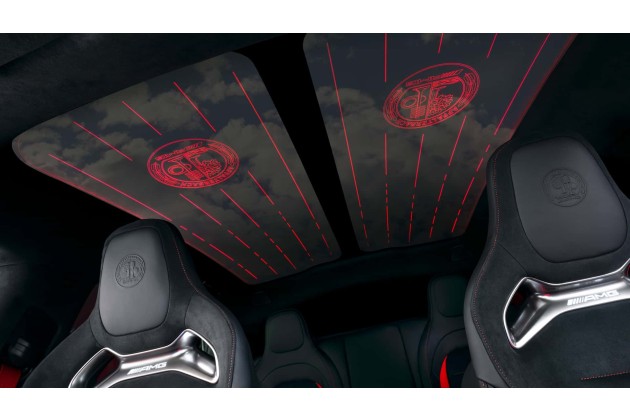 Serienmäßig gibt es ein Glasdach, das laut Mercedes bis zur Heckscheibe reicht. Optional kann es per Fingertipp zwischen transparent und undurchsichtig umgeschaltet werden. Das optionale Sky-Control-Dach ist in einzeln schaltbare Segmente unterteilt. Nachts kann das Glasdach optional in eine funkelnde Leinwand verwandelt werden, verspricht der Hersteller. Dabei erscheinen beleuchtete AMG-Embleme sowie "Rennstreifen" über den Köpfen der Insassen.
