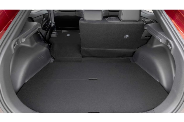 Der Kofferraum fasst 416 Liter, das Maximalvolumen beträgt laut Produktmanager Christian Sober knapp 1.300 Liter. Ein aus zwei einzelnen Brettern bestehender Einlegeboden kann in zwei verschiedenen Höhen positioniert werden, aber der Höhenunterschied ist gering. Einen Frunk besitzt der C-HR+ nicht.