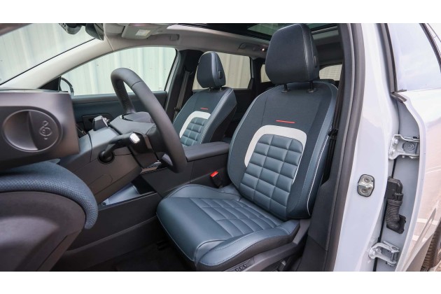 Vorn ist das Platzangebot solide, wird aber durch die breit ausladenden Türverkleidungen und die hochgezogene Mittelkonsole eingeschränkt. Beide Knie finden recht schnell harte Kontaktpunkte. Hinten sieht es gemischt aus: Kopffreiheit und Schulterfreiheit sind sehr gut, die Oberschenkelauflage trotz leicht erhöhtem Boden ordentlich. Der Knieraum ist für große Menschen nur gerade so ausreichend, was man reinen Elektroplattformen deutlich besser ansieht.