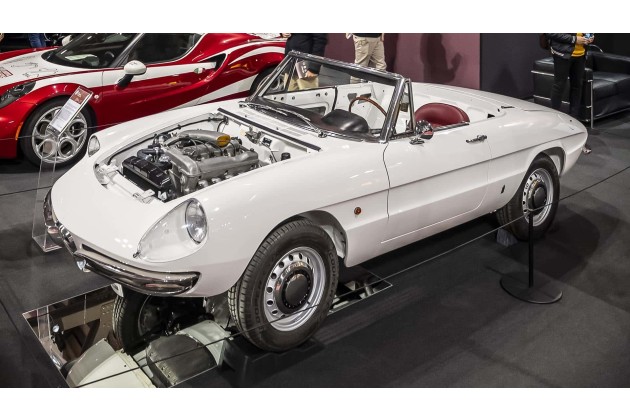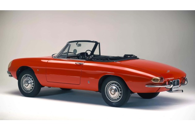 Die erste Begegnung der Öffentlichkeit mit dem 4,25 Meter langen Alfa Romeo Spider 1600 (80 kW/109 PS) gleicht einem Kulturschock. Die Fachwelt ist gespalten; vielen Alfisti ist der Bruch mit der Vergangenheit zu radikal, das konvexe Profil mit der tiefen Gürtellinie zu futuristisch. Unter der Haube arbeitet derweil bewährte Technik: Das Herz der Giulia Sprint GT Veloce sorgt für beachtliches Temperament.